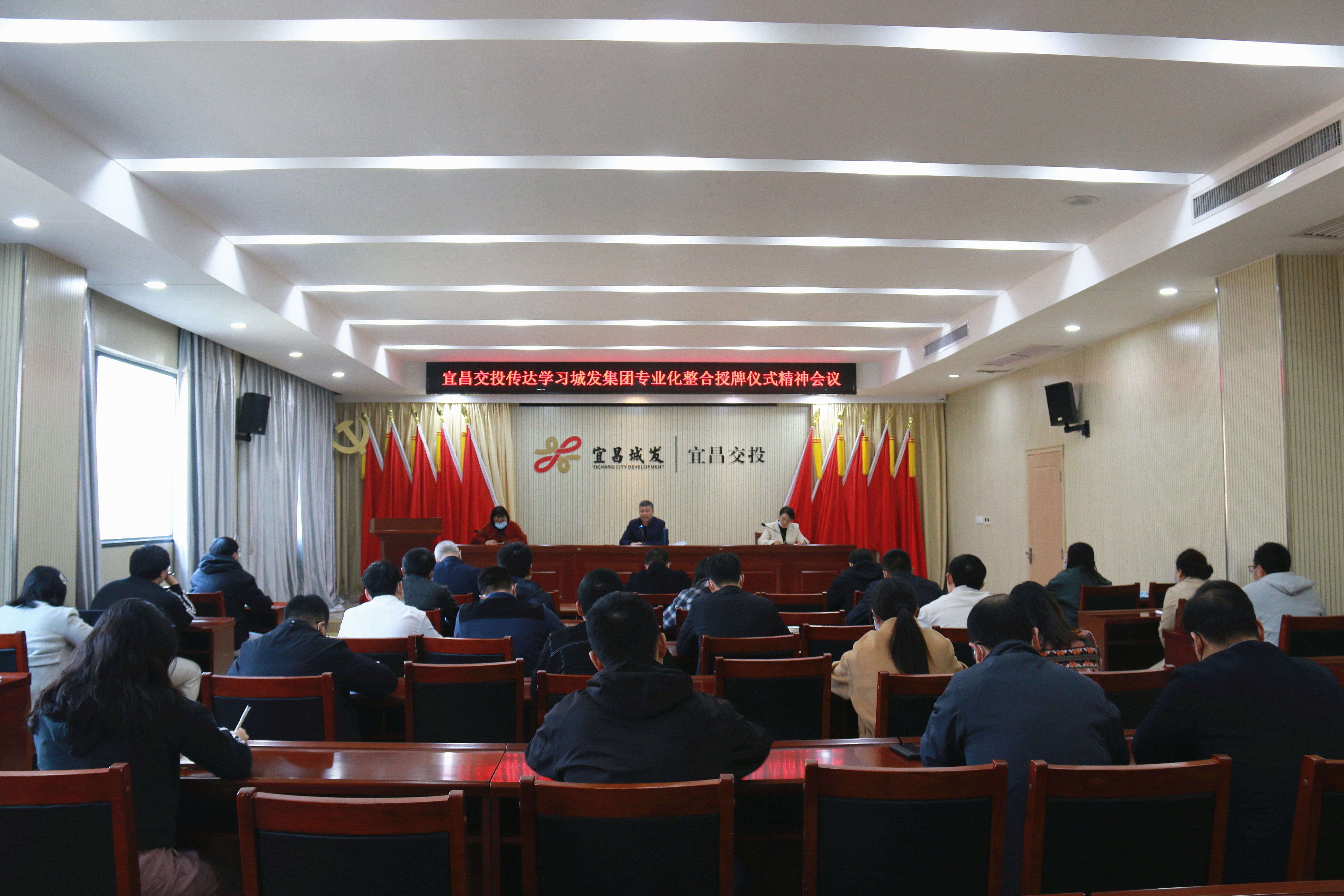 二、11月20日,宜昌城發(fā)投資集團(tuán)有限公司在交投大廈六樓會議室召開干部任職大會,傳達(dá)城發(fā)集團(tuán)專業(yè)化整合授牌儀式會議精神。城發(fā)集團(tuán)黨委委員、紀(jì)委書記劉仁,城發(fā)集團(tuán)黨委委員、副總經(jīng)理,城發(fā)投資集團(tuán)黨委書記、董事長李江濤,城發(fā)集團(tuán)黨委辦公室主任歐陽博,城發(fā)集團(tuán)組織部部長饒學(xué)敬出席會議,新成立的宜昌城發(fā)投資集團(tuán)有限公司全體領(lǐng)導(dǎo)班子成員、各子公司領(lǐng)導(dǎo)班子及中層干部參加了會議。會議由李江濤主持。會上宣讀了宜昌城市發(fā)展投資集團(tuán)有限公司關(guān)于組建宜昌城發(fā)投資集團(tuán)有限公司的通知和干部任免文件。城發(fā)投資集團(tuán)班子成員依次進(jìn)行表態(tài)發(fā)言。李江濤要求,集團(tuán)所屬各子公司要提高認(rèn)識,堅(jiān)定信心,把思想統(tǒng)一到改革發(fā)展的大局上來;要嚴(yán)肅紀(jì)律,端正作風(fēng),確保改革重組工作風(fēng)清氣正;要加強(qiáng)學(xué)習(xí),練就本領(lǐng),堅(jiān)決扛起城市建設(shè)主力軍的重任。城發(fā)集團(tuán)黨委委員、紀(jì)委書記劉仁強(qiáng)調(diào),城發(fā)投資集團(tuán)在城發(fā)集團(tuán)“255產(chǎn)業(yè)矩陣”中具有重要戰(zhàn)略意義,城發(fā)投資集團(tuán)要提高站位,自我加壓,對標(biāo)看齊,迅速完成公司班子成員分工、架構(gòu)整合、股權(quán)劃轉(zhuǎn)等各項(xiàng)規(guī)范化工作,不折不扣落實(shí)集團(tuán)既定的工作安排。要高點(diǎn)定位,統(tǒng)籌發(fā)展,做好2023年的謀篇布局工作,全力以赴推動明年重點(diǎn)項(xiàng)目建設(shè)工作強(qiáng)勢開局,堅(jiān)決扛起責(zé)任擔(dān)當(dāng),為城發(fā)集團(tuán)的高質(zhì)量發(fā)展貢獻(xiàn)堅(jiān)實(shí)力量。交投公司組織領(lǐng)導(dǎo)班子成員及中層干部參加大會,并層層傳達(dá)會議精神,抓好貫徹落實(shí)。