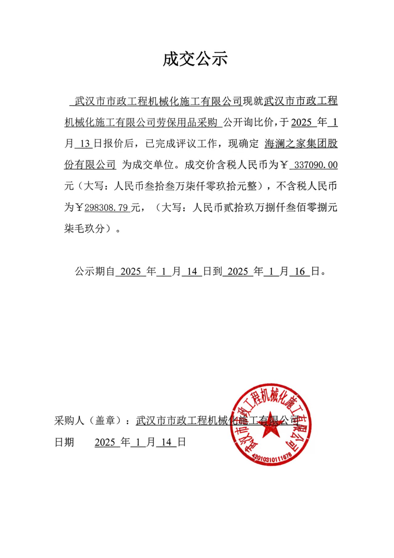 武漢市市政工程機(jī)械化施工有限公司勞保用品采購(gòu)成交公示