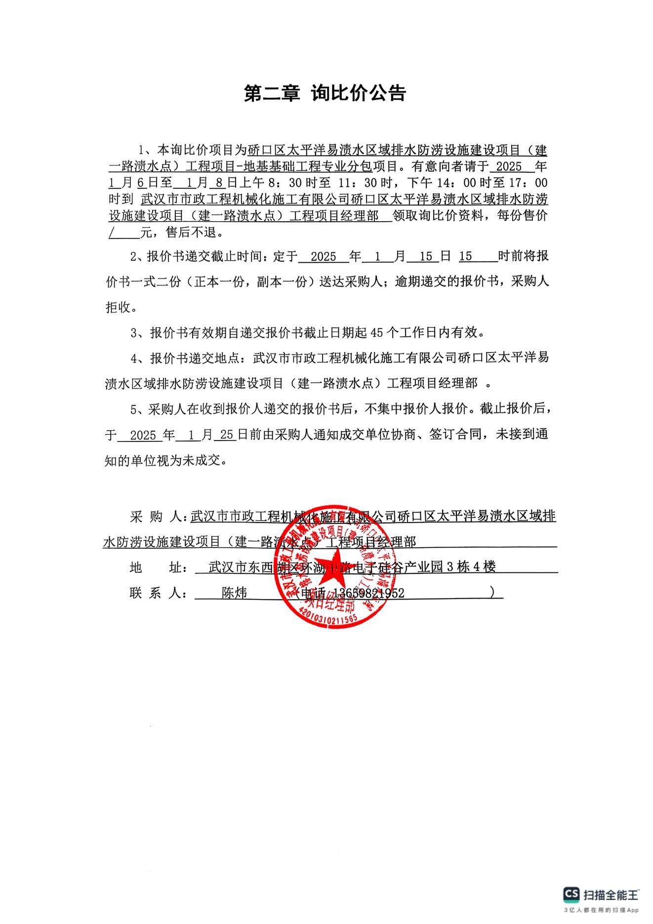 硚口區(qū)太平洋易漬水區(qū)域排水防澇設(shè)施建設(shè)項(xiàng)目(建一路漬水點(diǎn))工程項(xiàng)目-地基基礎(chǔ)工程專業(yè)分包詢價(jià)公告