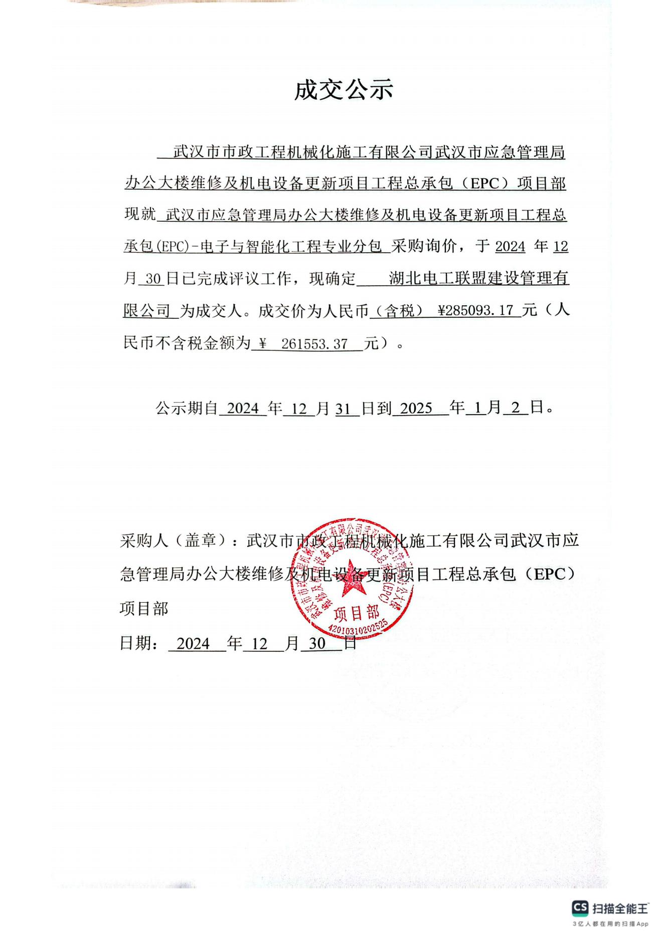 武漢市應(yīng)急管理局辦公大樓維修及機(jī)電設(shè)備更新項(xiàng)目工程總承包(EPC)-電子與智能化工程專業(yè)分包成交公示