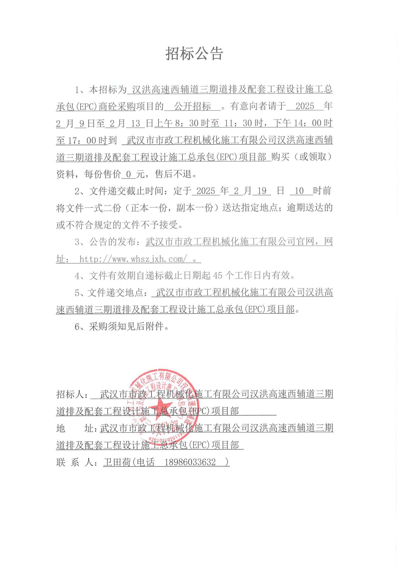 漢洪高速西輔道三期道排及配套工程設(shè)計施工總承包(EPC)商砼采購招標(biāo)公告