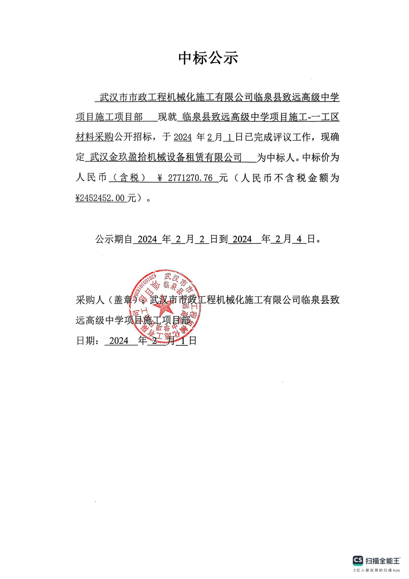 臨泉縣致遠(yuǎn)高級中學(xué)項目施工-一工區(qū)材料采購中標(biāo)公示