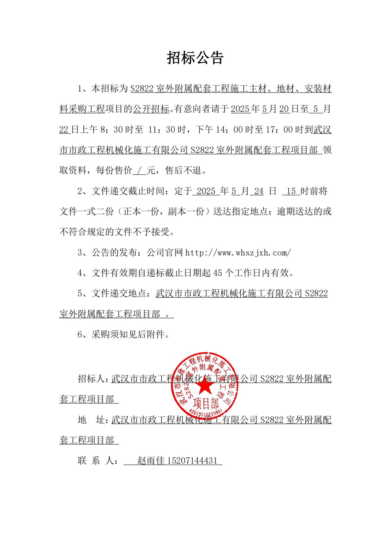 S2822室外附屬配套工程施工主材、地材、安裝材料采購(gòu)工程招標(biāo)公告