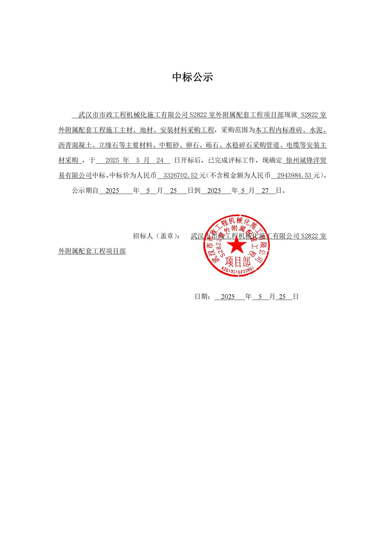 S2822室外附屬配套工程施工主材、地材、安裝材料采購工程中標公示