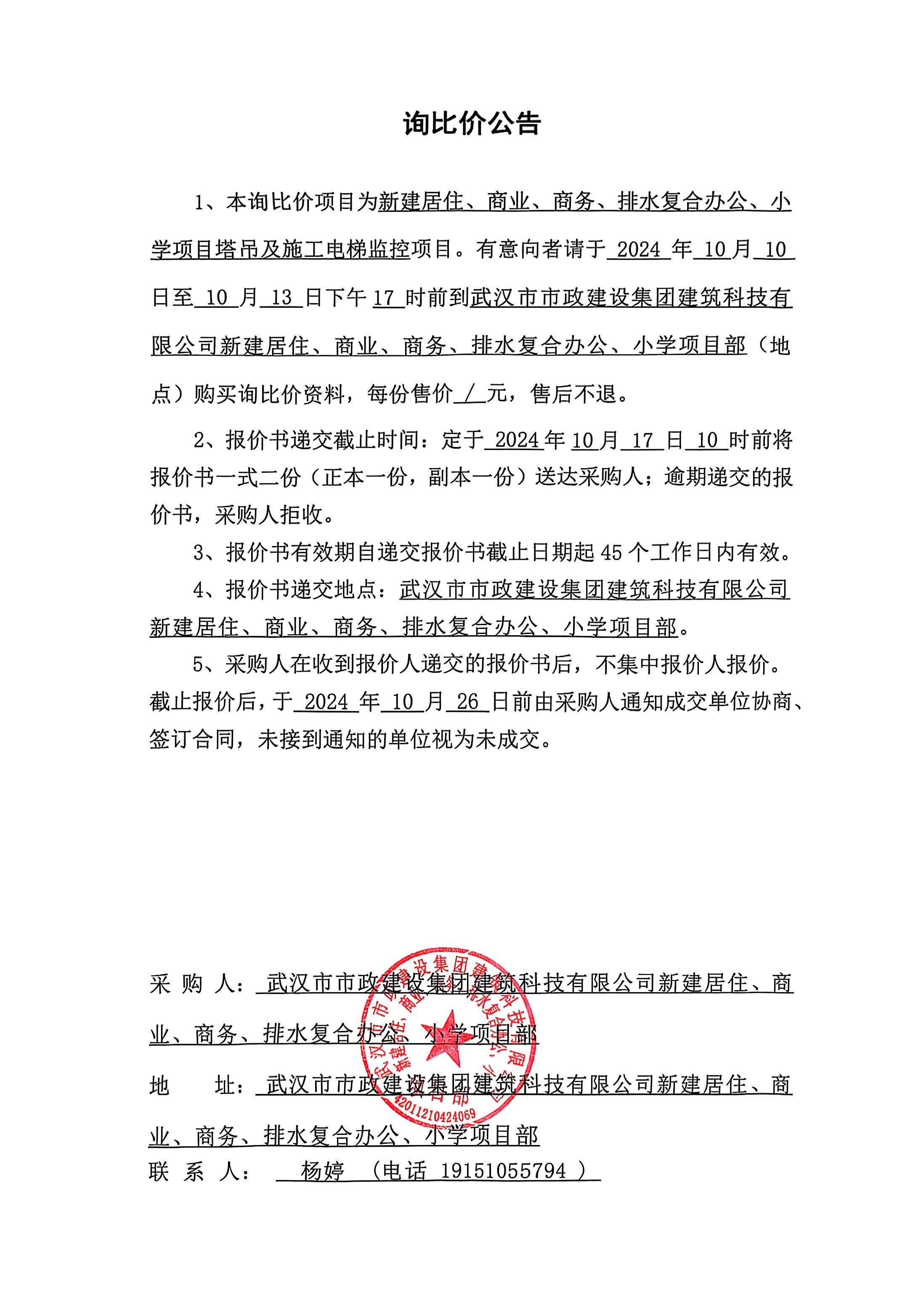 武漢市市政建設(shè)集團(tuán)建筑科技有限公司新建居住、商業(yè)、商務(wù)、排水復(fù)合辦公、小學(xué)項目塔吊及施工電梯監(jiān)控詢價公告