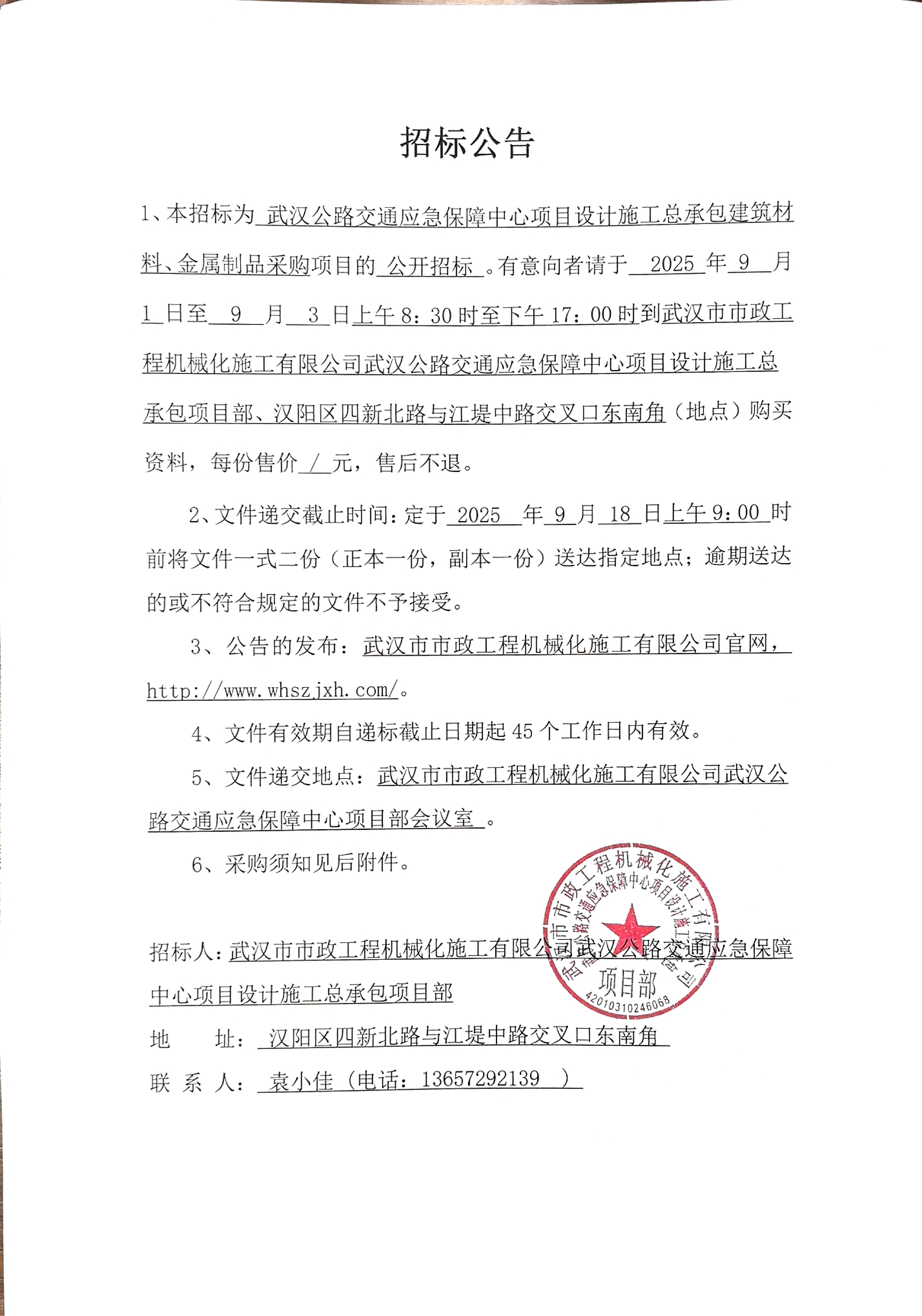 武漢公路交通應(yīng)急保障中心項(xiàng)目設(shè)計(jì)施工總承包建筑材料、金屬制品采購招標(biāo)公告