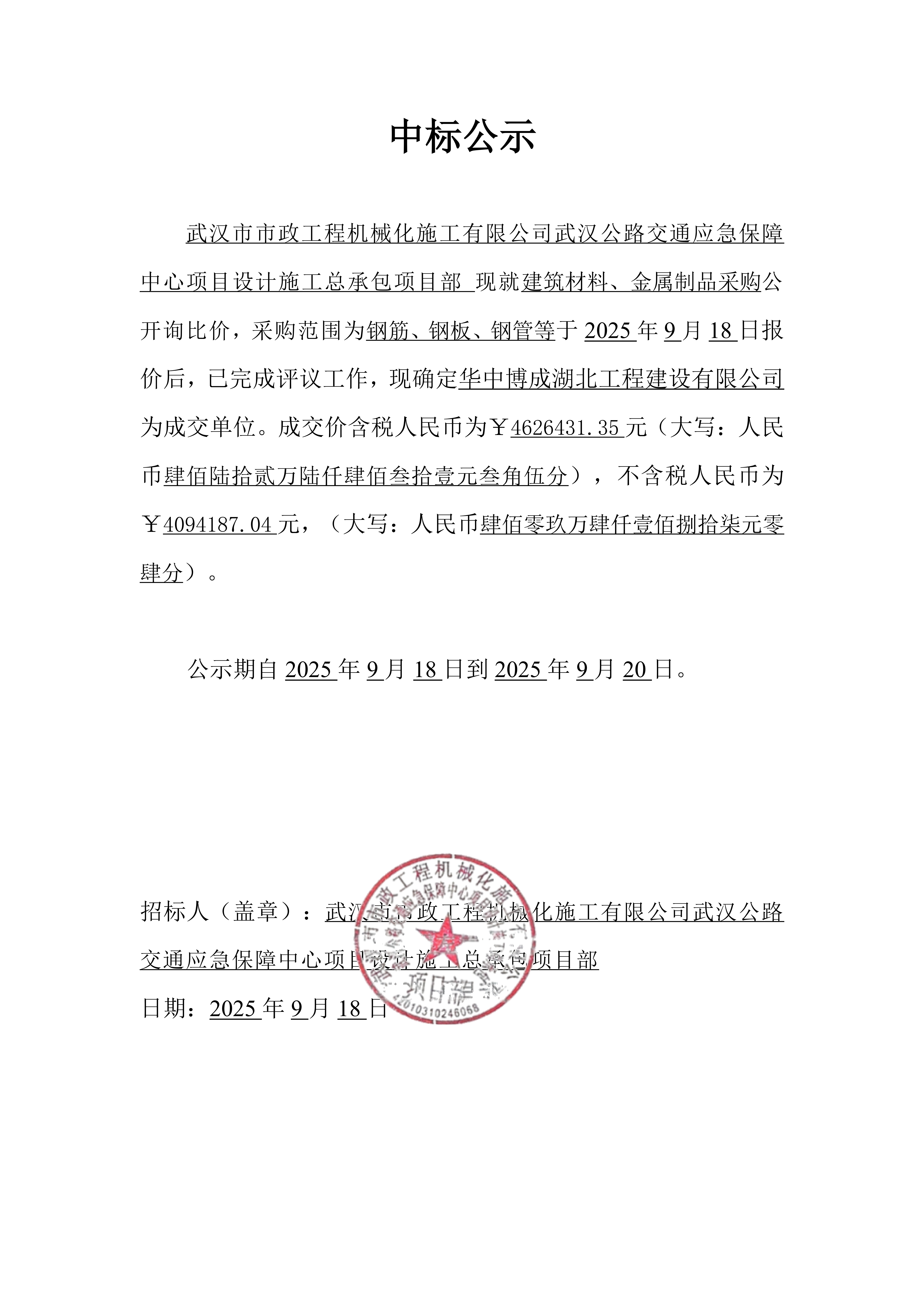 武漢公路交通應(yīng)急保障中心項(xiàng)目設(shè)計(jì)施工總承包建筑材料、金屬制品采購(gòu)中標(biāo)公示