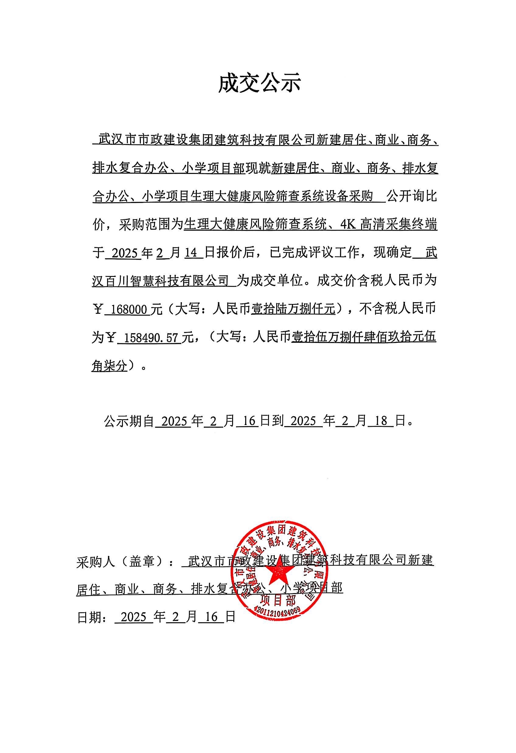武漢市市政建設集團建筑科技有限公司新建居住、商業(yè)、商務、排水復合辦公、小學項目生理大健康風險篩查系統(tǒng)設備采購成交公示