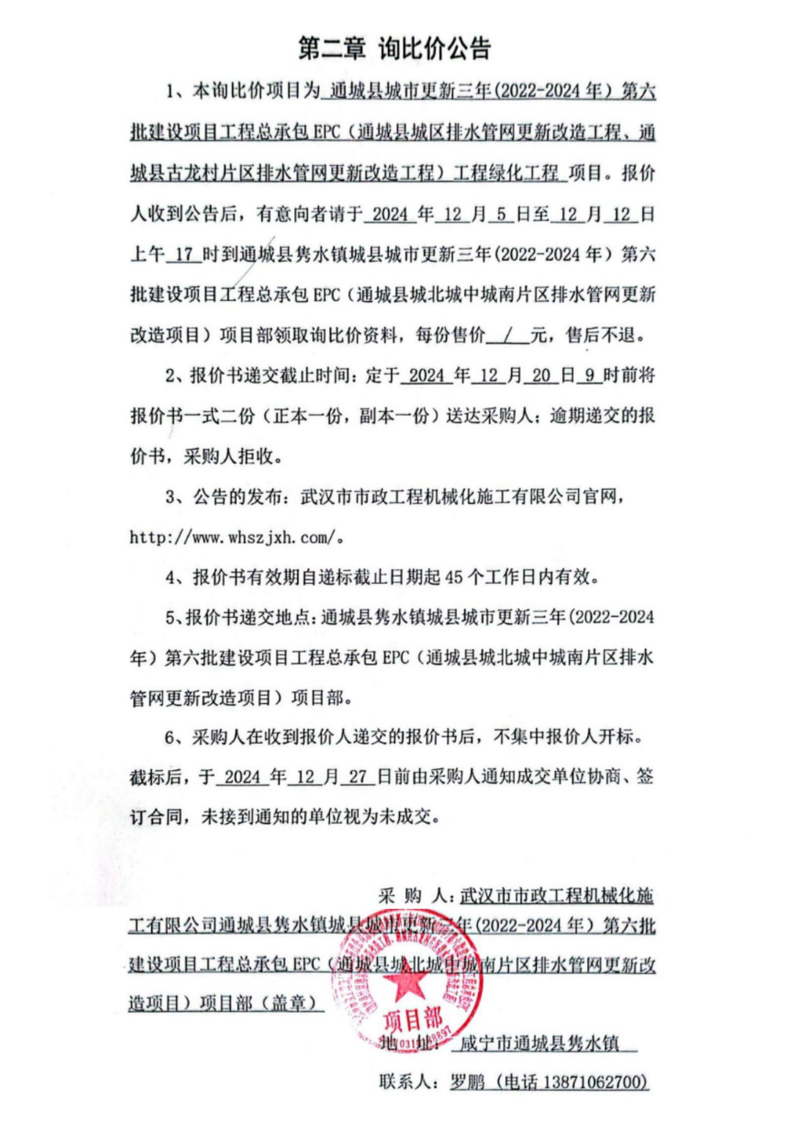 通城縣城市更新三年(2022-2024年)第六批建設(shè)項目工程總承包EPC(通城縣城區(qū)排水管網(wǎng)更新改造工程、通城縣古龍村片區(qū)排水管網(wǎng)更新改造工程)工程綠化工程詢價公告