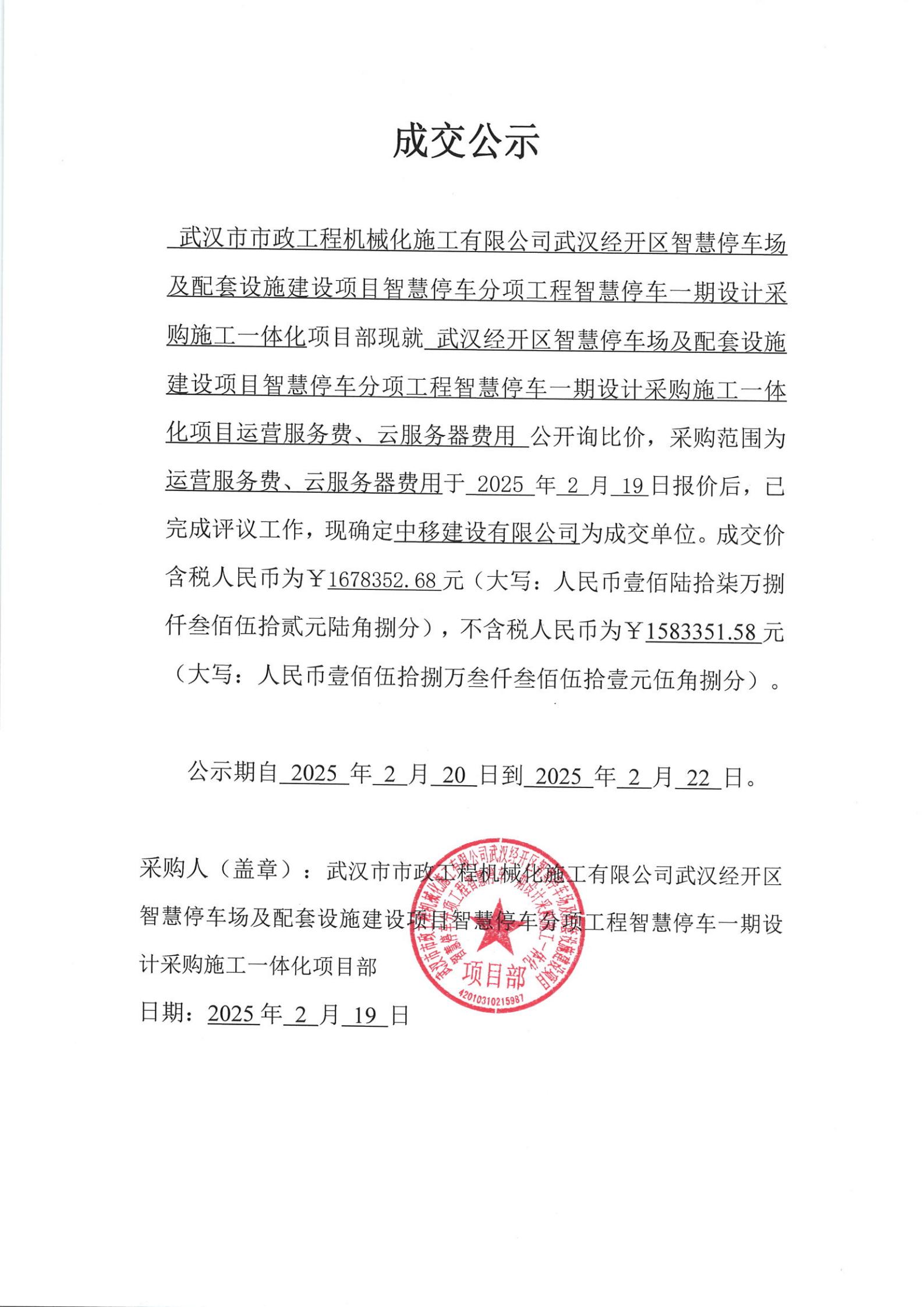 武漢經(jīng)開(kāi)區(qū)智慧停車場(chǎng)及配套設(shè)施建設(shè)項(xiàng)目智慧停車分項(xiàng)工程智慧停車一期設(shè)計(jì)采購(gòu)施工一體化項(xiàng)目運(yùn)營(yíng)服務(wù)費(fèi)、云服務(wù)器費(fèi)用成交公示