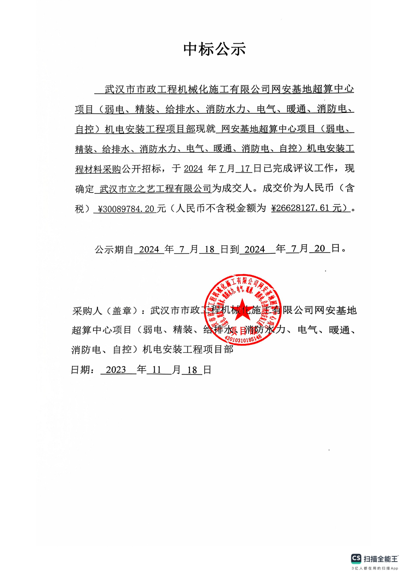 網(wǎng)安基地超算中心項(xiàng)目(弱電、精裝、給排水、消防水力、電氣、暖通、消防電、自控)機(jī)電安裝工程-材料采購中標(biāo)公示