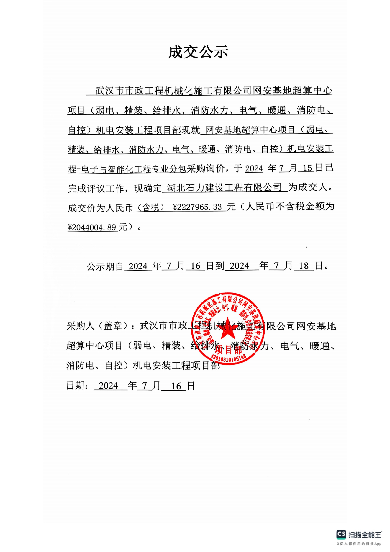 網(wǎng)安基地超算中心項(xiàng)目(弱電、精裝、給排水、消防水力、電氣、暖通、消防電、自控)機(jī)電安裝工 程-電子與智能化工程專業(yè)分包采購詢價(jià)成交公示成交公示