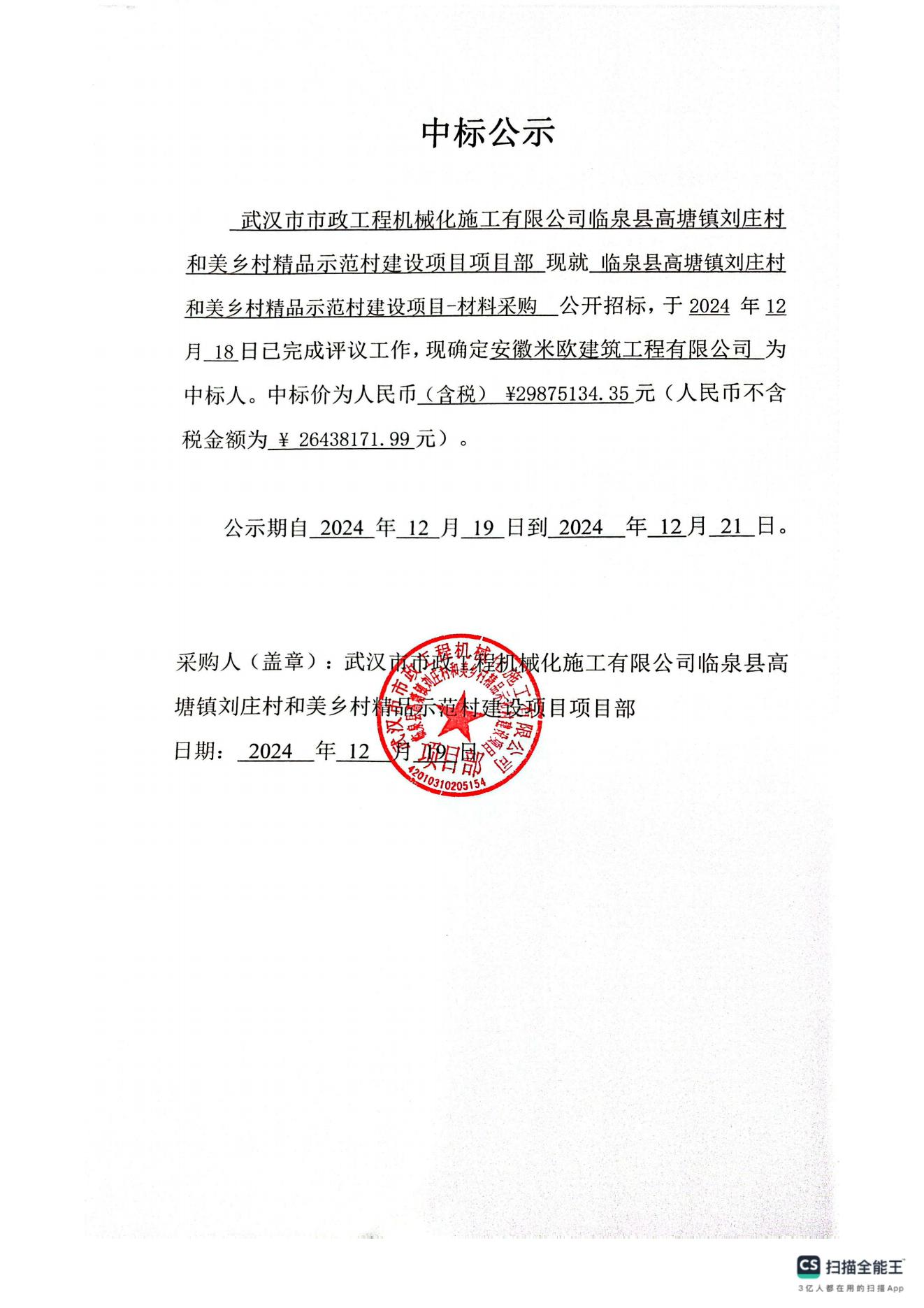 臨泉縣高塘鎮(zhèn)劉莊村和美鄉(xiāng)村精品示范村建設項目-材料采購中標公示