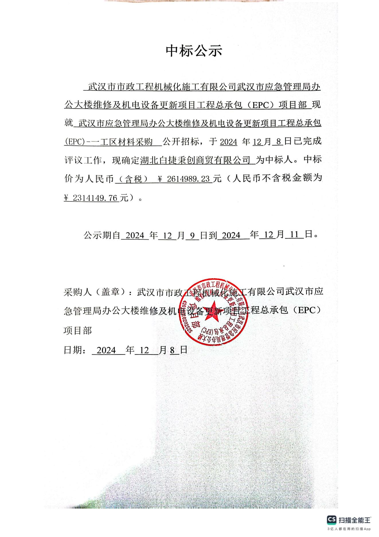 武漢市應急管理局辦公大樓維修及機電設備更新項目工程總承包(EPC)-一工區(qū)材料采購中標公示