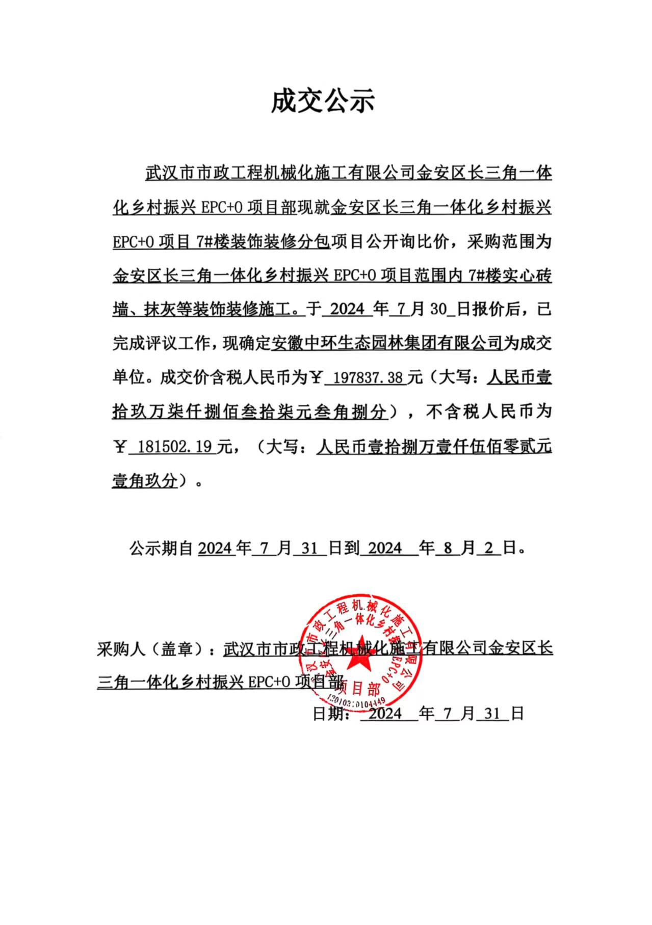 金安區(qū)長(zhǎng)三角一體化鄉(xiāng)村振興EPC+O項(xiàng)目7#樓裝飾裝修分包成交公示