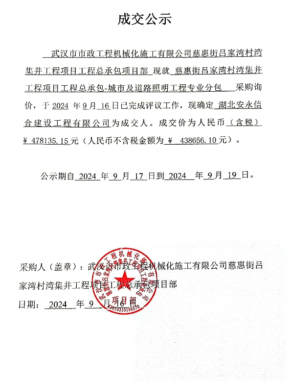 慈惠街呂家灣村灣集并工程項(xiàng)目工程總承包-城市及道路照明工程專業(yè)分包詢價(jià)公告成交公示
