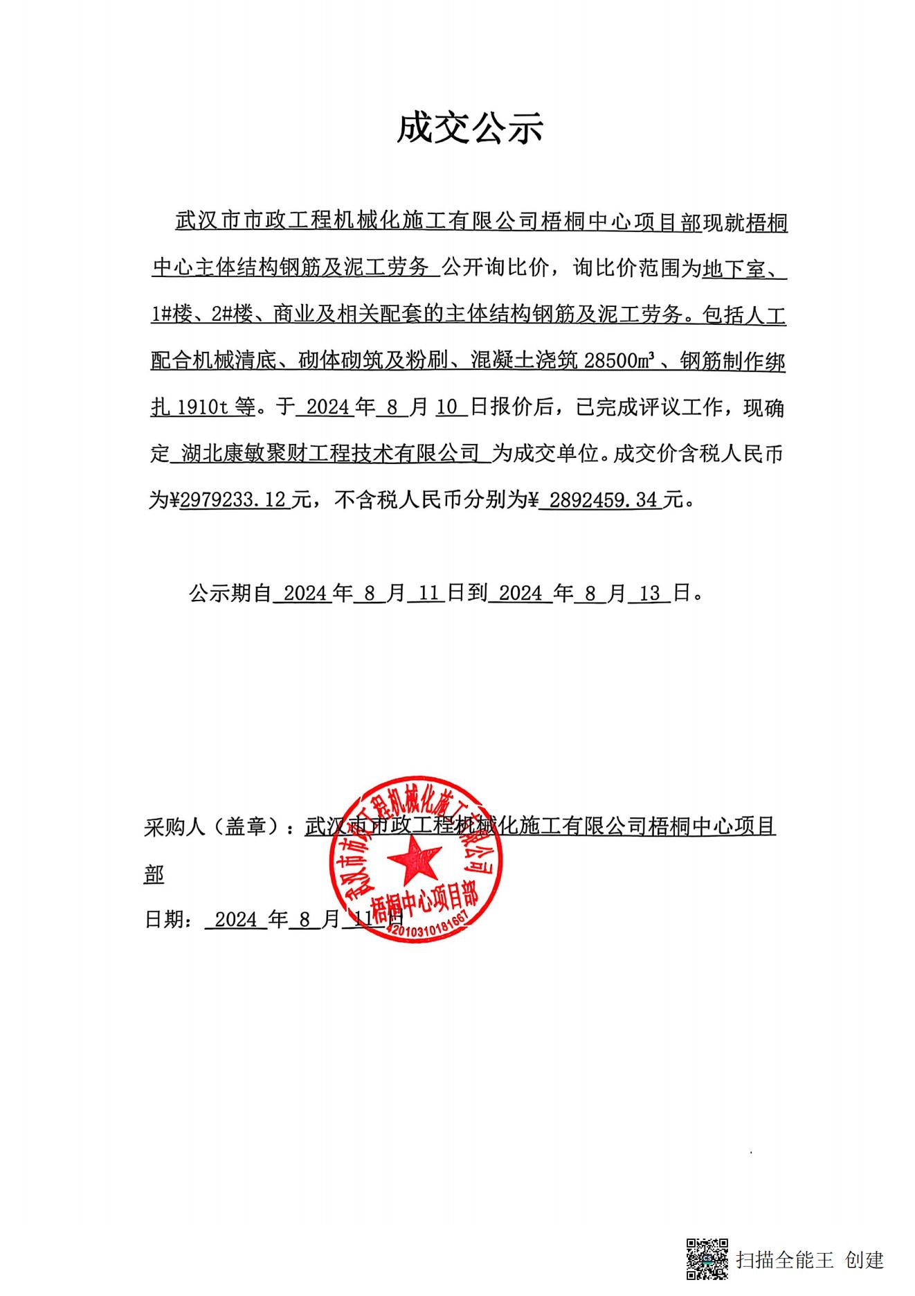 梧桐中心主體結(jié)構(gòu)鋼筋及泥工勞務(wù)成交公示