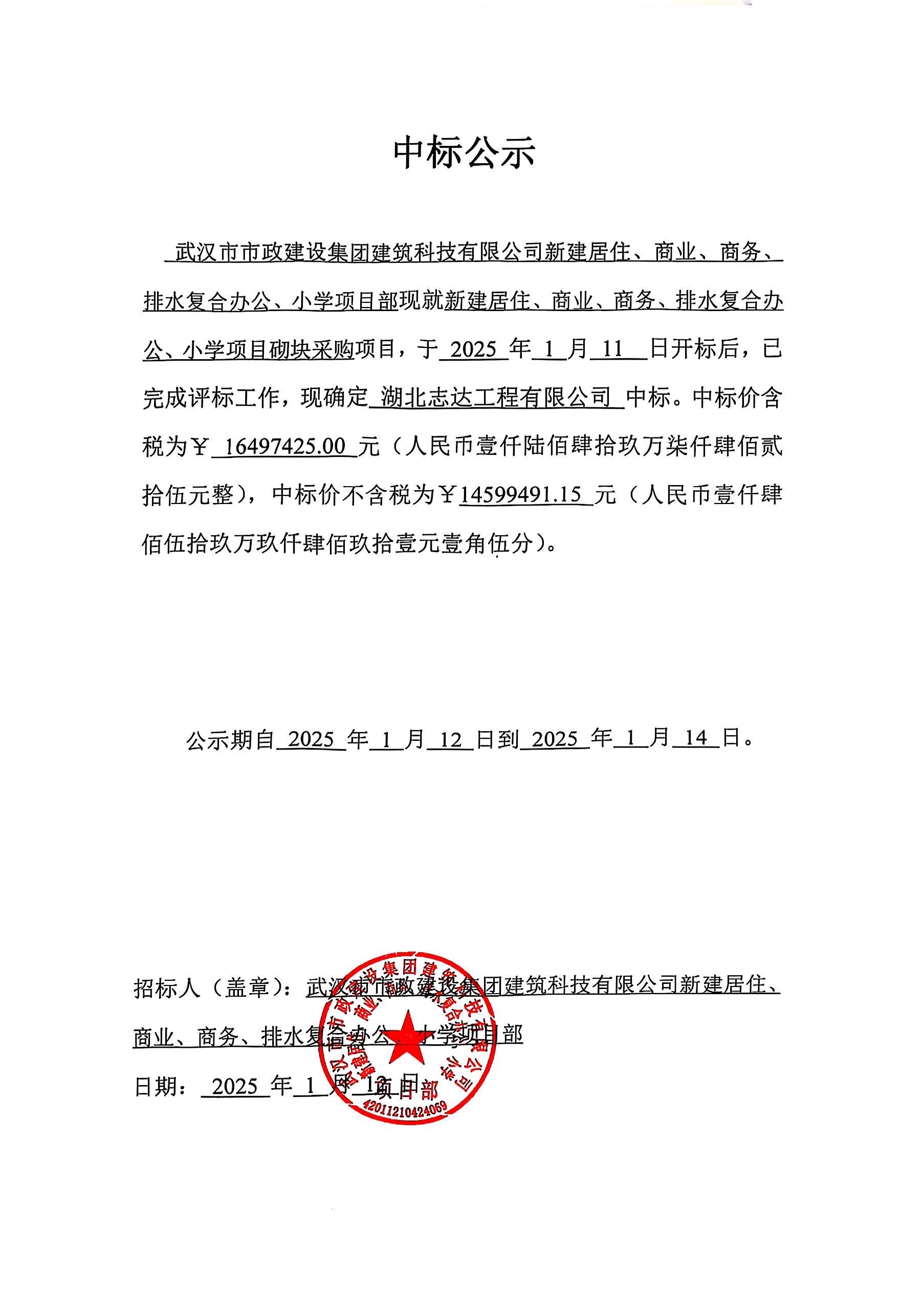 武漢市市政建設(shè)集團(tuán)建筑科技有限公司新建居住、商業(yè)、商務(wù)、排水復(fù)合辦公、小學(xué)項(xiàng)目砌塊采購中標(biāo)公示