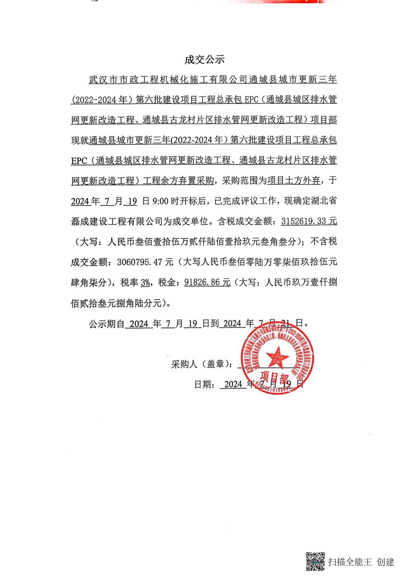 通城縣城市更新三年(2022-2024年)第六批建設項目工程總承包EPC(通城縣城區(qū)排水管網(wǎng)更新改造工程、通城縣古龍村片區(qū)排水管網(wǎng)更新改造工程)工程余方棄置采購成交公示