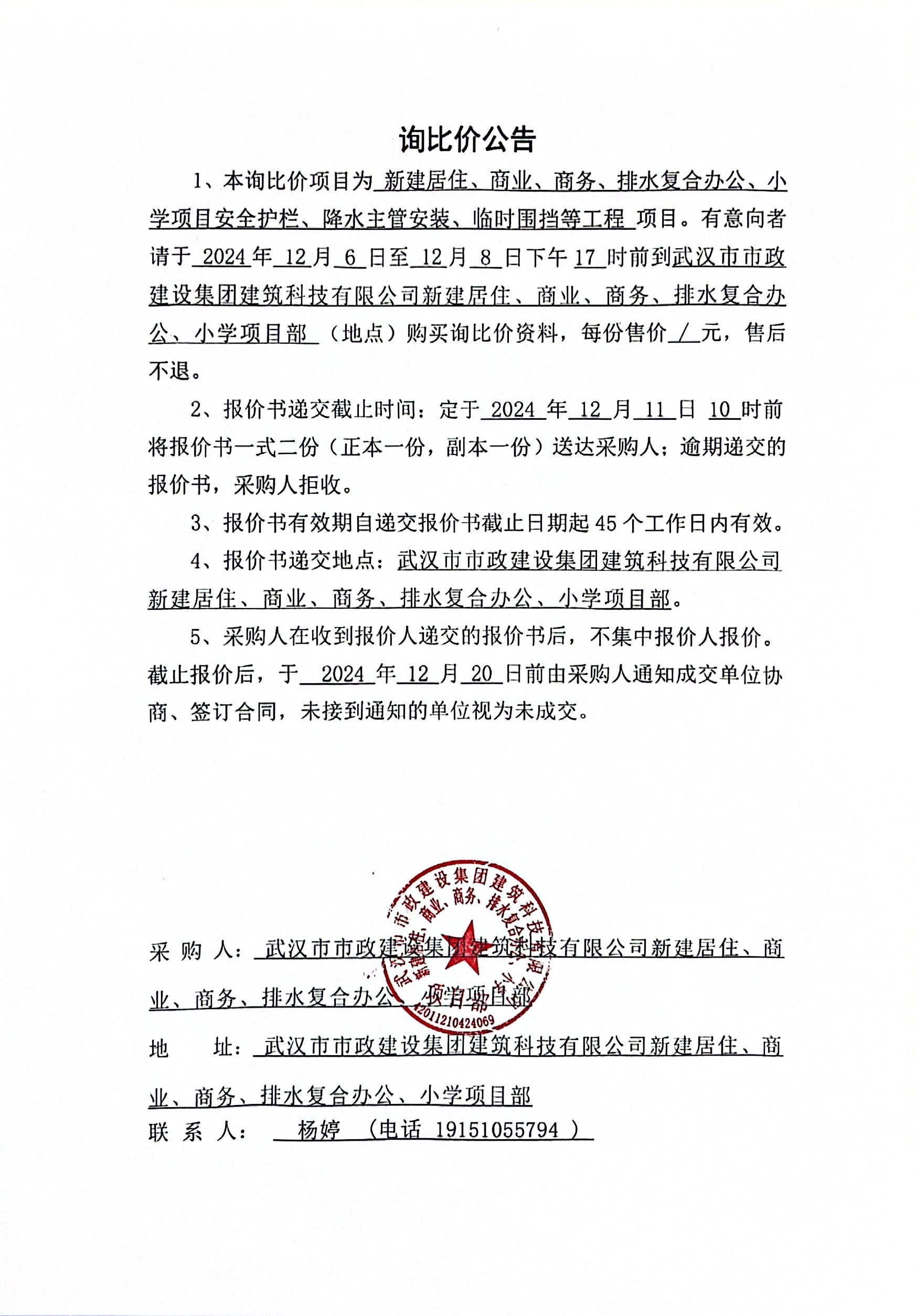 武漢市市政建設(shè)集團(tuán)建筑科技有限公司新建居住、商業(yè)、商務(wù)、排水復(fù)合辦公、小學(xué)項(xiàng)目安全護(hù)欄、降水主管安裝、臨時(shí)圍擋等工程詢比公告