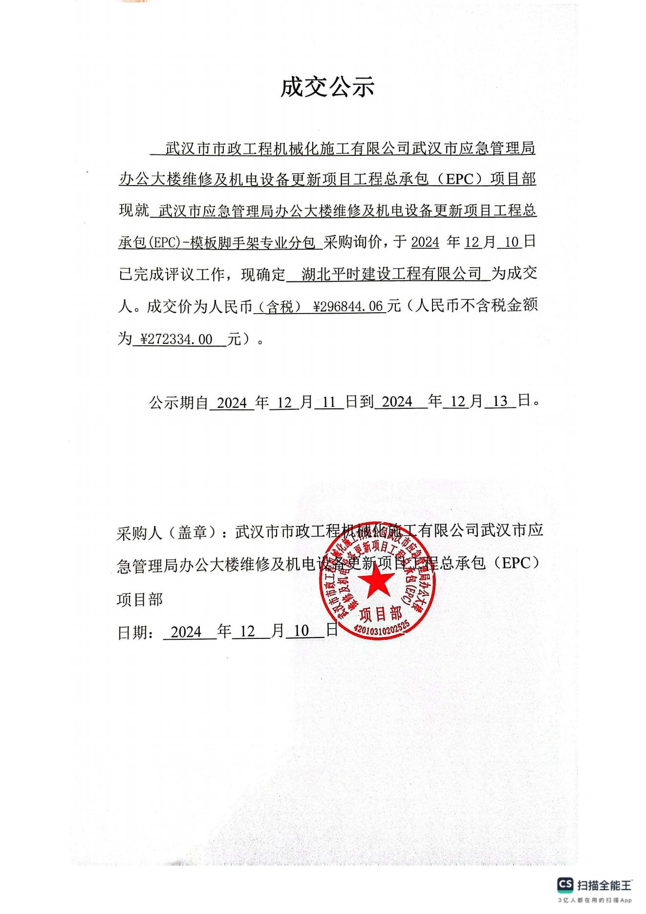 武漢市應(yīng)急管理局辦公大樓維修及機(jī)電設(shè)備更新項(xiàng)目工程總承包(EPC) -模板腳手架專(zhuān)業(yè)分包成交公示
